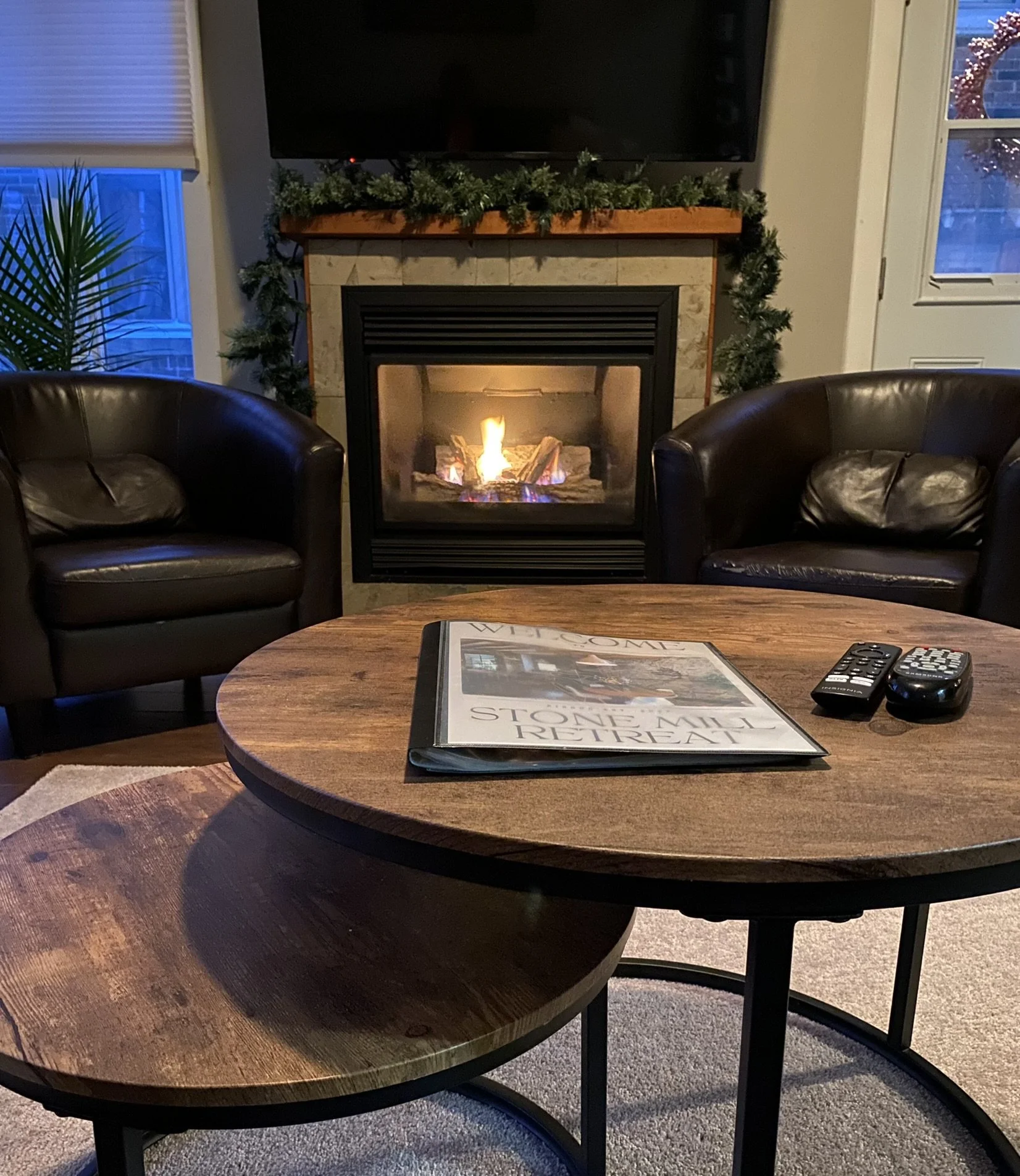 Bask in the morning sunshine streaming through the windows, nestled by the warmth of the glowing fireplace at your peaceful escape with a fresh cup of coffee in hand & all the rustic ambiance the open stone has to offer.
