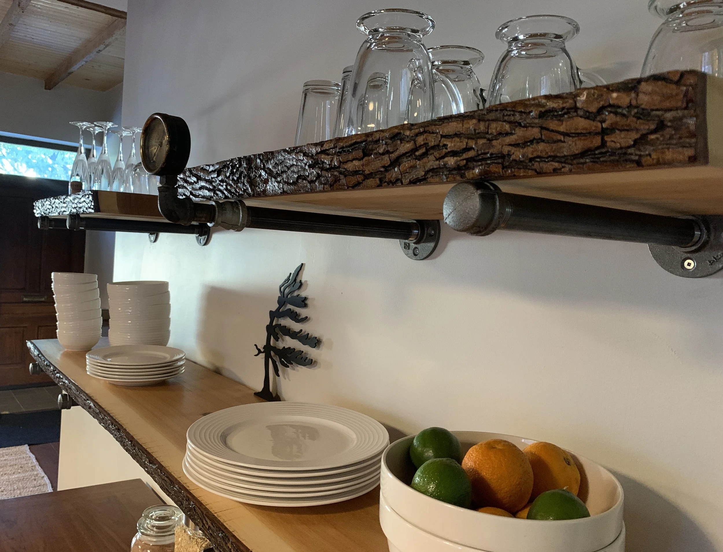 With true rustic open stone and beam feel, step into our inviting culinary space and discover your inner chef. Our fully equipped kitchen includes master hand-crafted, live-edge shelving, complete with everything for your dining needs. Store your market fresh groceries in our full fridge, and enjoy your morning coffee with our Keurig coffee maker or stove top Espresso maker. Also stocked with all the essential utensils, our kitchen is stocked for everything needed to create a memorable meal.