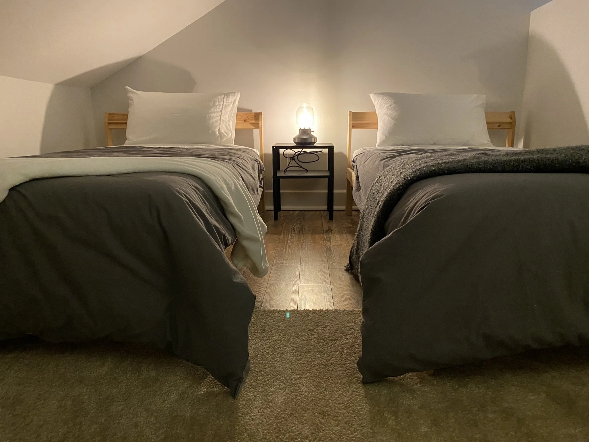 Extending to our top floor includes our cozy loft. This space boasts two comfortable twin beds, providing a comfortable night's sleep for two guests. Enjoy the natural light and views of the stars through our stunning skylight, which adds a touch of magic to your stay. Ready for your retreat with a good book, laptop movie, morning yoga or simply a zen moment or two. Book your stay with us today and experience the charm and comfort of our lovely loft!